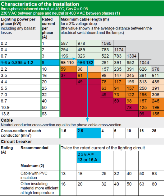 Lighting power per phase (P): 910 + 91 = 1001 W = 1 kW.